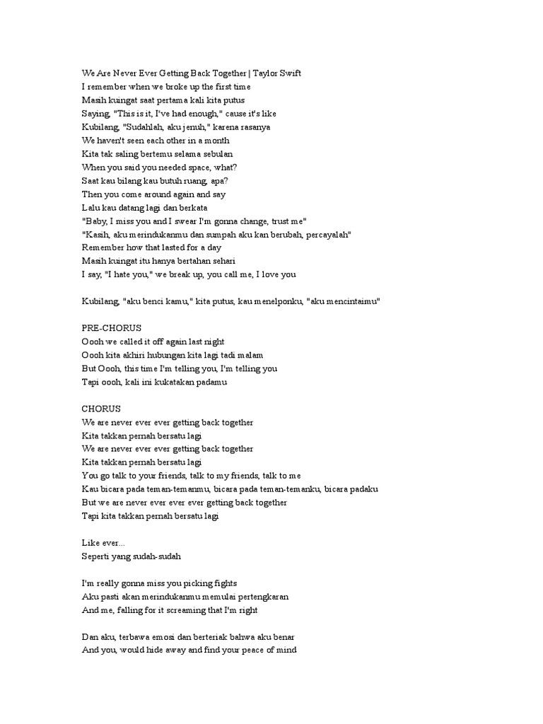 We are never ever ever ever getting back together We are never ever ever ever getting back together You go talk to your friends talk And my friends talk to me But we are never ever ever ever getting back together I used to think, that we, were forever ever ever And I used to say never say never Uggg, he calls me up and he's like, I stillWe are never, ever, ever getting back together We are never, ever, ever getting back together You go talk to your friends, talk to my friends, talk to me But we are never, ever, ever, ever getting back together Like, ever Verse 2 I'm really gonna miss you picking fights And me, falling for it, screaming that I'm rightAbout Press Copyright Contact us Creators Advertise Developers Terms Privacy Policy & Safety How YouTube works Test new features Press Copyright Contact us Creators